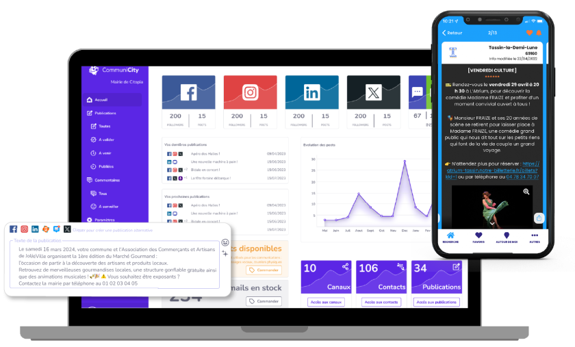 Communiquez avec vos citoyens sur tous vos canaux en quelques clics : réseaux sociaux, emails, alertes SMS, site internet, application mobile, panneau lumineux ...